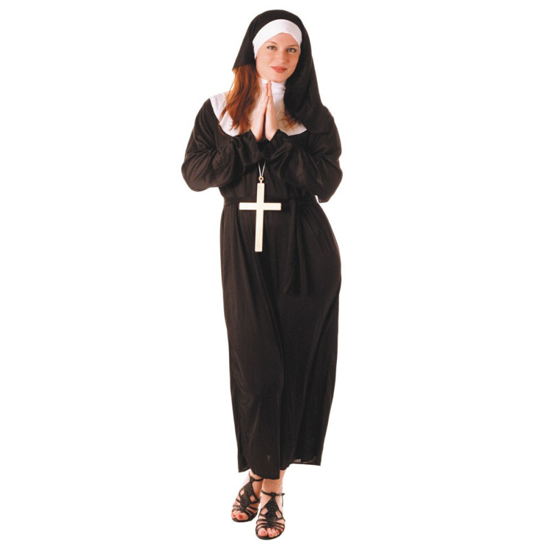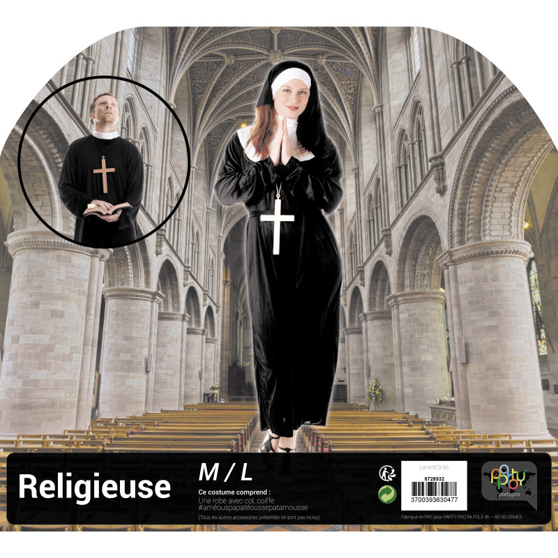 Ce costume de Religieuse se compose de la robe noire avec le col blanc et de la coiffe noire et blanche. 100% polyester, Taille Unique M/L.