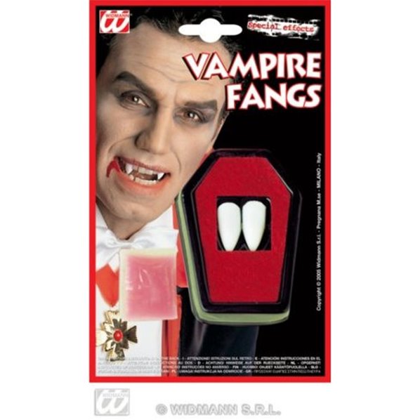 Paire de Dents du vampire avec 2 capsules de sang. Nettoyez les dents du vampire minutieusement puis insérez-les sur vos propres dents. Ne convient pas aux enfants de moins de 14 ans