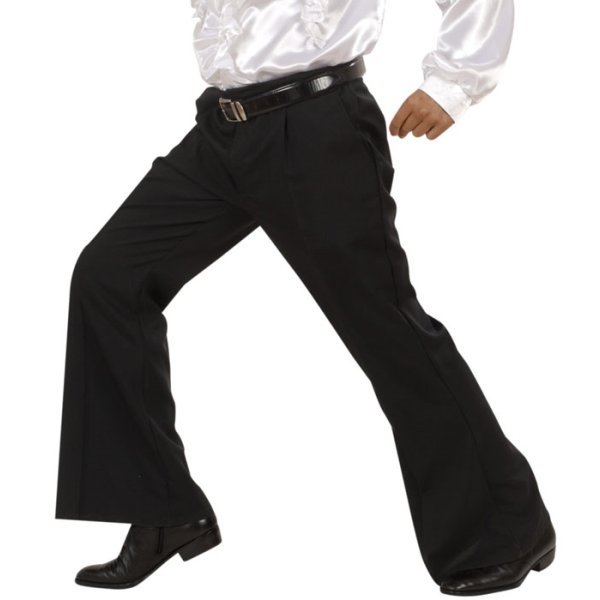 Ce pantalon disco noir pour homme pattes d'éléphant est 100% polyester, Taille XL (46) il a un élastique à la taille pour mieux s'adapter.