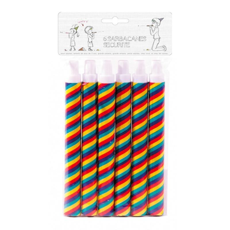 Ces sarbacanes multicolores ou unicolores assorties sont en carton, Elles mesurent 18 cm et sont équipées d'un embout en plastique de sécurité pour éviter les risques d'étouffement. Envoi selon disponibilités (multicolores ou unicolores assortis).